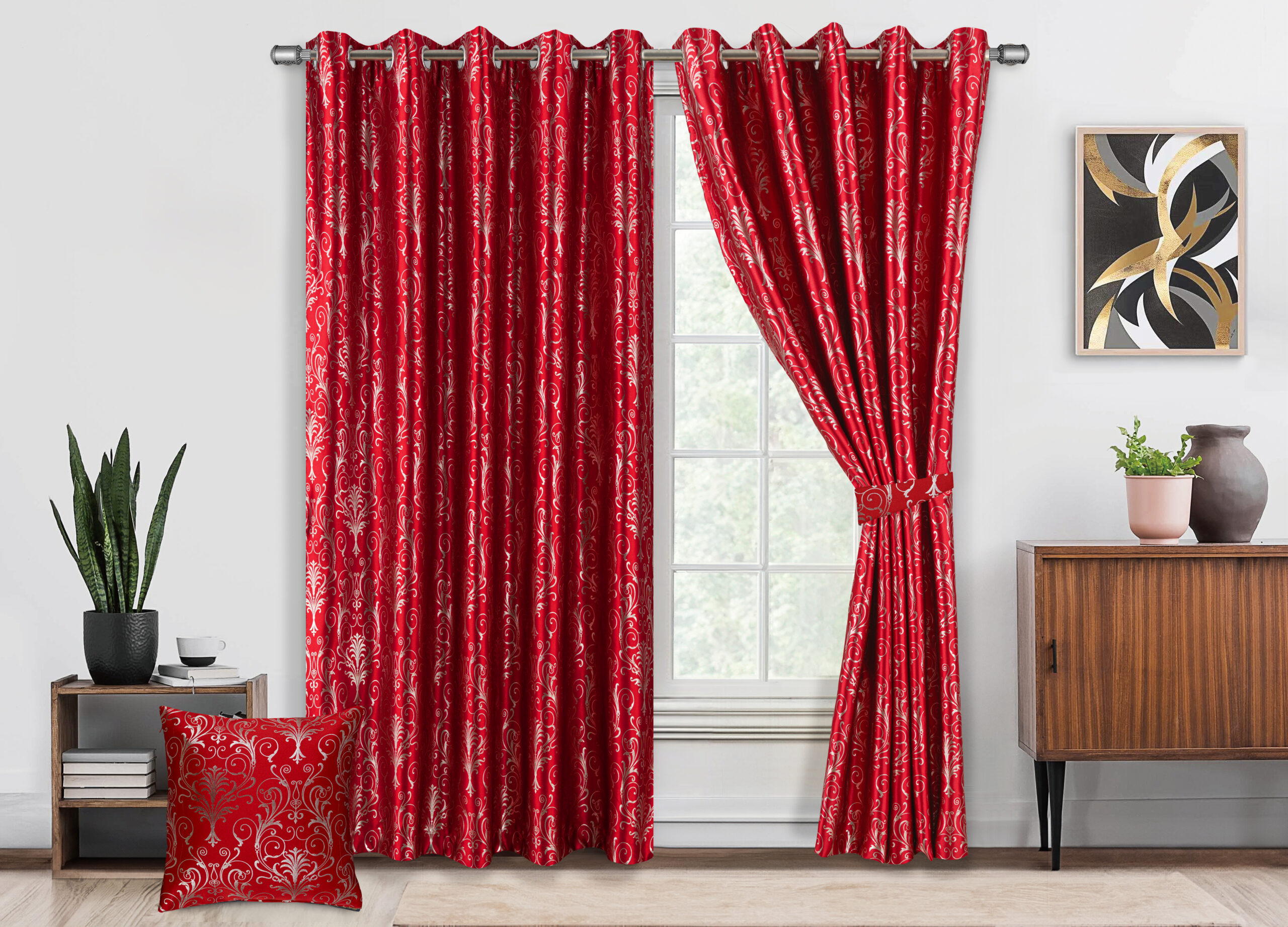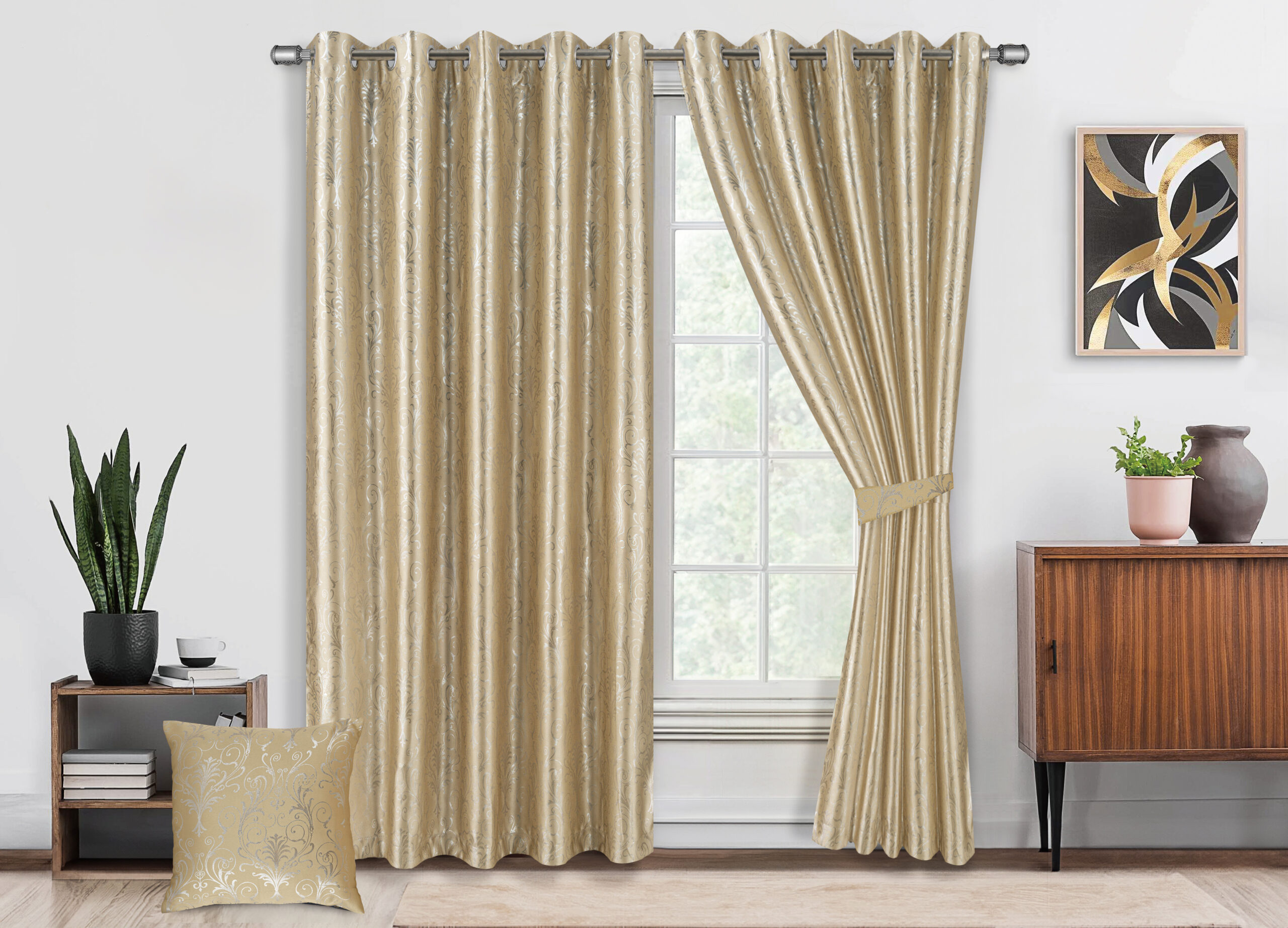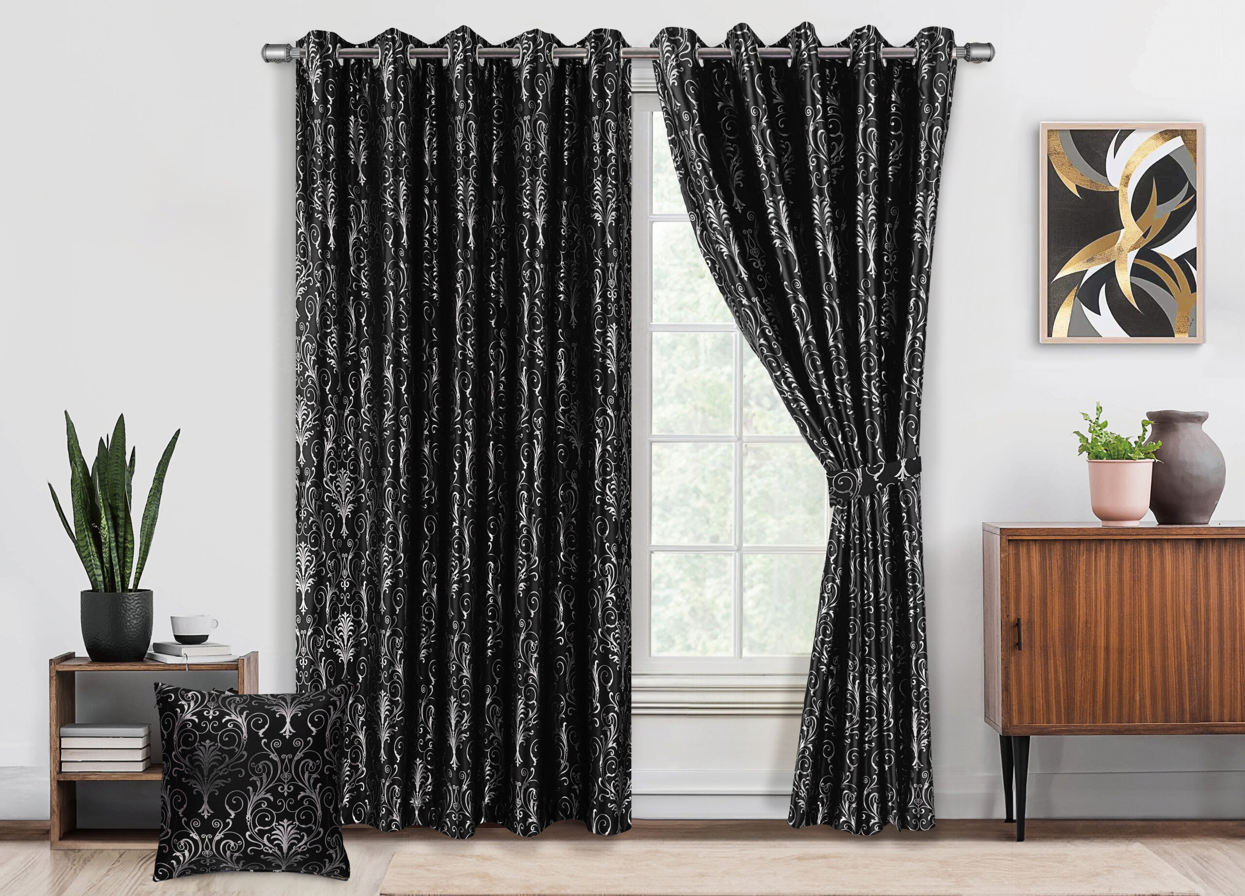 Each package includes 2 metallic foil printed blackout curtain panels with tiebacks, available in multiple sizes and colors to match your home décor. Please measure your windows carefully before purchasing to ensure the perfect fit.